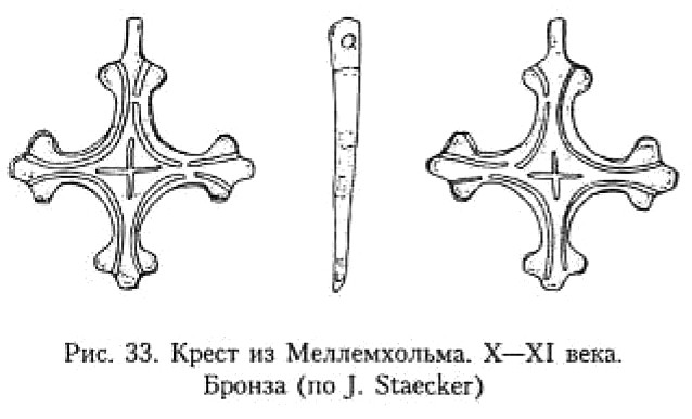 В X–XI веках появляются кресты достаточно специфической формы, отнесённой Й. Стаекером к типу 1.4.2270. В несколько видоизменённом виде такие кресты встречаются, помимо Скандинавии, в Северной и Центральной части Восточной Европы, где и именуются «скандинавскими» У нас в стране им посвящено немало статей и публикаций271, по этой причине в настоящей работе я привожу лишь несколько образцов подобных изделий. К их числу относится бронзовый крест из Меллемхольма272 (рис. 33). Крест построен по модели «греческого». Средокрестие ромбовидно. Лопасти резко расширяются к оконечностям, образуя трилистник. Центр средокрестия украшен с лицевой и оборотной стороны гравировкой «греческого» креста, лопасти дополнительно орнаментированы гравированными линиями.