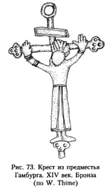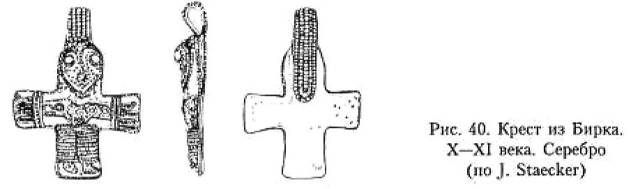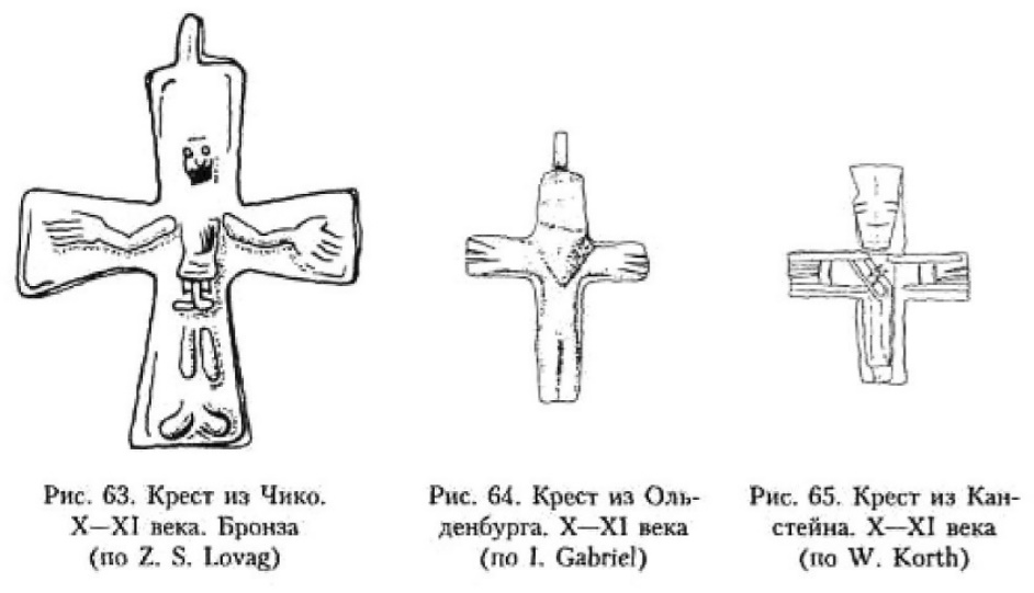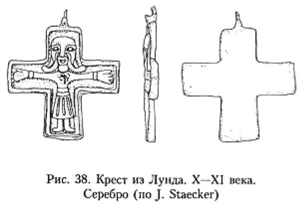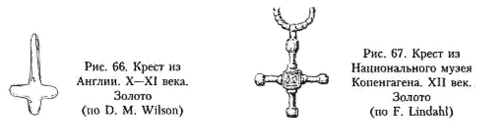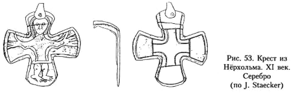 В X–XI веках в Скандинавии появляются кресты-тельники с изображением распятого Иисуса. Традиция появления изделий с так называемым грубым изображением Христа, по справедливому заявлению В. В. Седова, уходит в Центральную Европу273. В Скандинавии таких предметов обнаружено довольно большое количество. Их наиболее полный свод представлен в монографиях Й, Стаекера и П. Пурхонен274. Надо сказать, что практически каждый такой крестик с Распятием представляет своеобразное произведение декоративно-прикладного искусства. Тем не менее, учитывая характер данной работы, я вынужден подойти и к этому материалу дифференцированно, отослав заинтересованного читателя к монографиям П. Пурхонен и особенно Й. Стаекера.