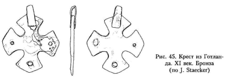 Продолжается традиция наиболее ранних для Скандинавии нательных крестов, уже охарактеризованных выше (рис. 25, 26), с той лишь разницей, что оконечности лопастей превращаются из округлых в подтреугольные, при этом в основе остаётся «греческая» модель креста. В качестве примера можно привести бронзовый крест из Готланда287 (рис. 45). Его особенностью является наличие сквозных круглых отверстий в лопастях – черта, также имеющая место в изделиях X–XI веков (рис. 31).