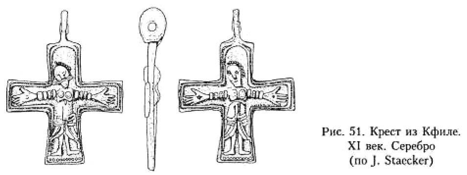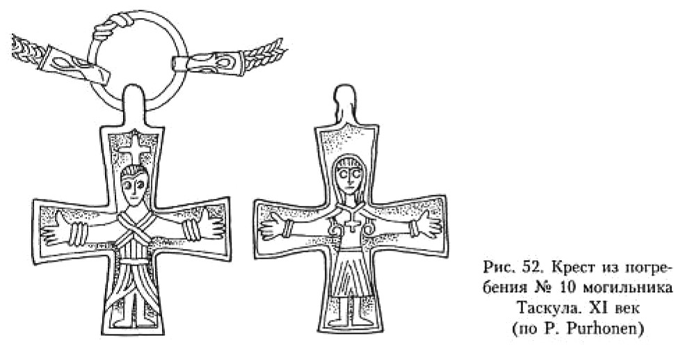 В Финляндии в погребении № 10 могильника Таскула обнаружен крест XI века295, выполненный по «греческому» образцу. На лицевой стороне изображена фигура распятого Спасителя в длиннополой одежде, с косым крестом на груди и привязанными к горизонтальной перекладине руками (рис. 52). На оборотной стороне распятая фигура с крестом-тельником на груди.