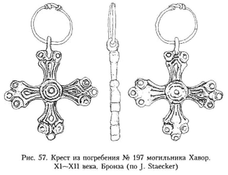 В ХII веке в этом регионе Европы мода на кресты-тельники с Распятием проходит. По-прежнему имеют место кресты «скандинавского» типа. Одним из типичных образцов таких изделий является крест из погребения № 197 могильника Хавор XI–ХII веков300. Массивный бронзовый крест имеет типичную форму (рис. 57). Он выполнен по модели «греческого» креста. Лопасти резко расширяются от круглого средокрестия и завершаются трёхчастной пальметкой. Средокрестие и оконечности креста украшены циркульным орнаментом, а сами лопасти – вписанными друг в друга ромбовидными фигурами. Оборотная сторона тельника украшена аналогично лицевой, что также, в общем-то, характерно для крестов этого типа.