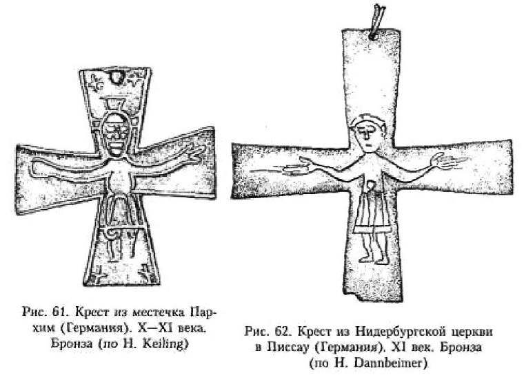 Серия крестов-тельников из различных памятников Европы относится к X–XI векам. Можно сразу сказать, что некоторые из них продолжают линию развития с изображением распятого Иисуса, правда, изображения эти стали ещё более схематичными и, я бы сказал, даже примитивными по сравнению с теми, что имели место в первые века бытования. Так, в местечке· Пярхим (Parchim) в Восточной Германии обнаружен бронзовый нательный крестик304 (рис. 61). Изделие выполнено по «греческому» образцу. Лопасти креста резко расширяются от средокрестия. По периметру, исключая торцы перекладин, крестик оконтурен тонким рельефным валиком. В верхней вертикальной лопасти проделано отверстие для подвешивания. Всю лицевую поверхность занимает фигура распятого Христа. Она передана крайне небрежно и схематично. Лицо, кисти рук, ноги показаны, по существу, условно, наибольшее внимание мастер сосредоточил на лике Иисуса (который хотя предельно схематичен, тем не менее демонстрирует глаза, нос, усы и бороду) и его одежде – короткой, по колено, складчатой тунике. За головой Спасителя изображён крест или, возможно, условно переданный нимб. В углах вертикальных лопастей креста нанесены небольшие крестики с равновеликими лопастями.