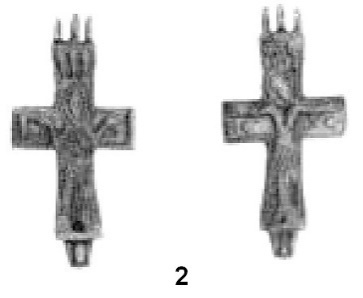 Серебряный крестик из Готланда278 выполнен по модели «греческого» креста. Лопасти его слегка расширяются от средокрестия (рис. 37). Крестик по периметру оконтурен рельефным валиком, при этом дополнительно выделены углы лопастей. Всю лицевую часть изделия занимает фигура распятого Спасителя. Особое внимание мастер уделил показу развёрнутых кистей рук, складчатой короткополой одежды. Необычным является демонстрация лика с проработанными чертами, загнутые вверх усы и такая же «корона» на голове. На руках также нетипичный орнамент в виде завитков, а над головой Иисуса – крест.