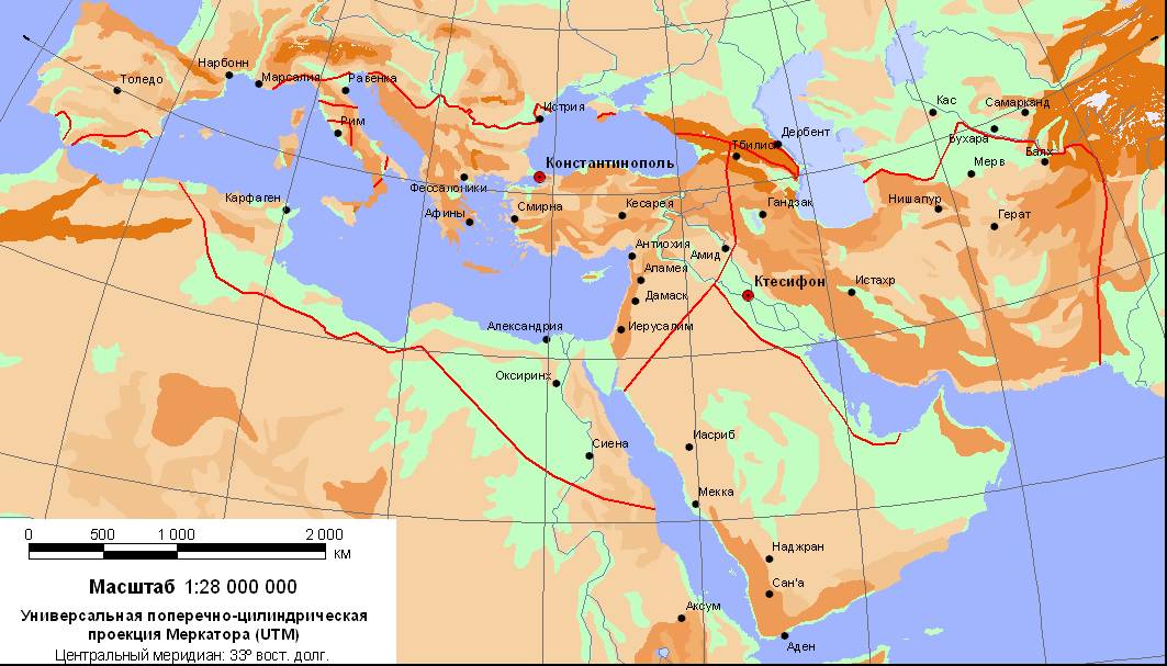 Посмотрим прежде всего, что представляла собой в начале VII в. та обширная часть Азии, Северной Африки и Южной Европы от Гибралтара до Гиндукуша и от Кавказа до Адена, на которой предстояло развернуться интересующим нас событиям. Отвлекаясь от частностей и превратностей той эпохи, богатой войнами и изменениями политических границ, можно сказать, что обширная полоса Старого Света, расположенная примерно между 30° и 40–45° с. ш., была поровну поделена между двумя великими державами: западную ее половину занимала Византийская империя, восточную – Сасанидская. Площадь первой была около 2,8 млн. км2, площадь второй – 2,9 млн. км2; население, по-видимому, тоже было примерно одинаковым – около 30 млн. человек в каждой42. Этим равенством в значительной степени объяснялись ничейные результаты неоднократных войн за господство на Ближнем Востоке.