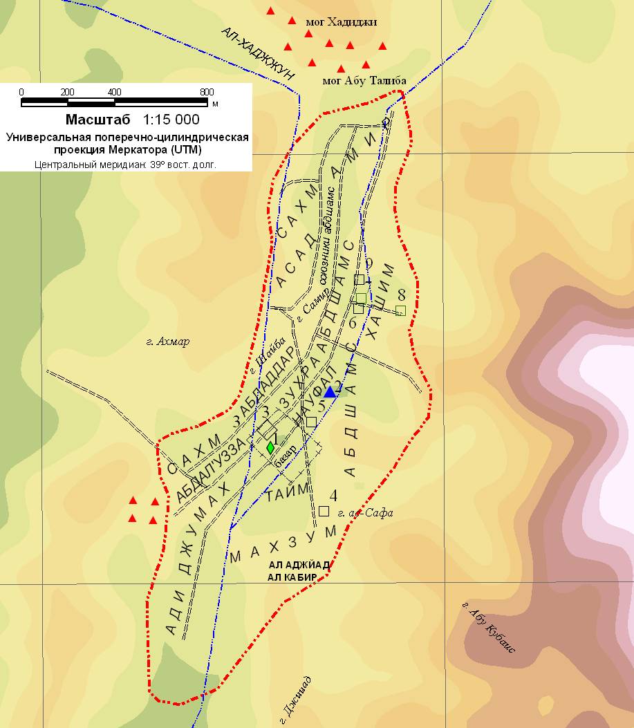 Уплотнение застройки вызывало бытовые конфликты, выраставшие во вражду между отдельными родами и семьями. Так, часть бану ади, живших между вади и скалистым холмом ас-Сафа, из-за вражды с бану абдшамс переселилась в Нижний город на участок, купленный у бану сахм137, а освободившееся место заняли несколько семей из абдшамс. Мелкие перемещения, несомненно, происходили постоянно, но чаще всего в пределах своего родового участка, поэтому общая картина размещения родов существенно не изменилась за полтора века.
