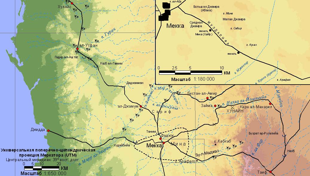 В последней четверти VI в.169 в 100 км восточнее Мекки, около Карн ал-Маназил (ныне Эс-Сайль-эль-Кабир), в урочище Указ, возникла новая ярмарка, ставшая важным торговым центром Северной Аравии. В Указе ярмарка начиналась в зу-л-ка́да, в конце месяца она перемещалась в Маджанну, а затем, 1–7 зу-л-хиджжа, – в Зу-л-Маджаз, в 5–6 км от Арафата170. Сразу же после закрытия ярмарки паломники шли к Арафату и начинали обряд хаджжа.