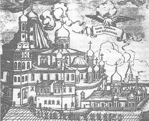 Вершиной храмосоздательства Патриарха Никона является Новый Иерусалим. Покинув 10 июня 1658 г. первосвятительский Престол, он поселился в Воскресенском монастыре, где к 1656 г. уже была освящена деревянная церковь Воскресения Христова и заложен храм по образу храма Гроба Господня в Иерусалиме. Возведение «великой церкви» началось 27 апреля 1658 г., и в дальнейшем все строительные работы в монастыре велись под руководством Патриарха Никона. Число братии монастыря к середине 1660-х гг. достигло 500 человек. Столько же было и трудников – рабочих, занятых на работе в хозяйственных и строительных службах.