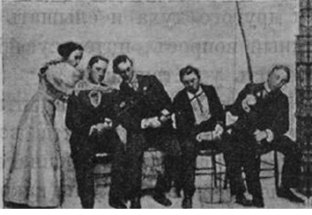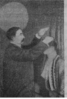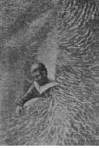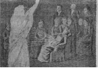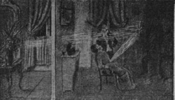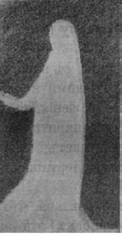 Затем рисунок 149 изображает инсценированный спиритический сеанс, с появлением духа среди сеансирующих в своем нормальном одеянии, с протянутой рукой к двери, а рисунок 150 дает воспроизведение фотографического снимка, где дух облачен в белую тогу. Все это ничто иное, как одна сплошная подделка, любезно зафотографированная для настоящего труда пр. повер. С. М. Павловским и инженером Сабининым.