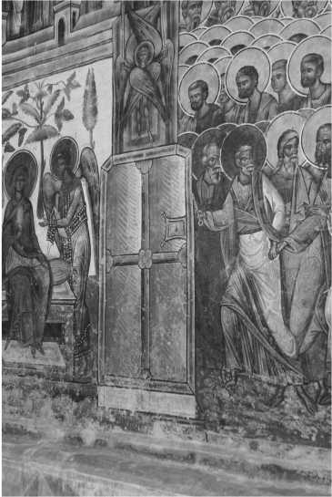 Plate 38 The western outside wall of the 16th- century church at Voronets, Romania, depicting the Doomsday. The golden gate depicts the entrance to Paradise guarded by an Archangel. Photo by John McGuckin.