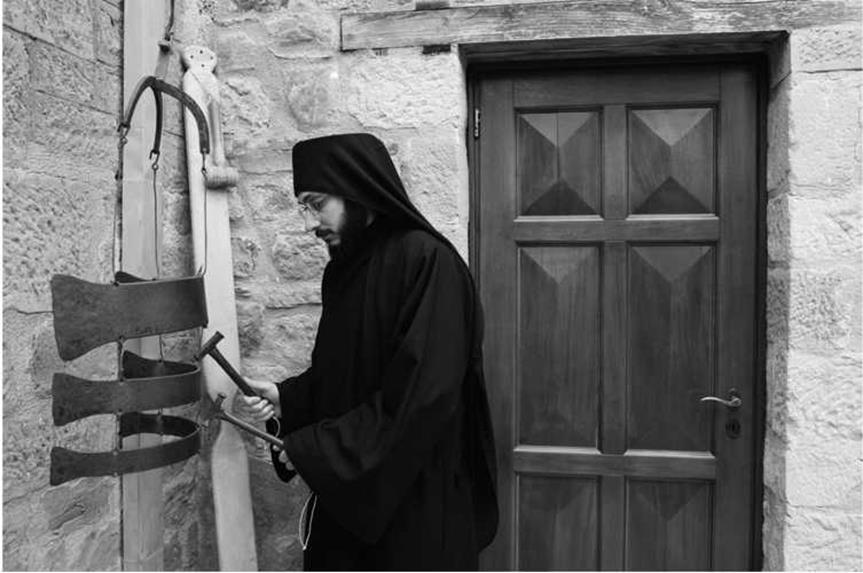 Plate 39 Orthodox monk wearing the kamilavki (hat) sounding the monastic tantalon (bell for service) with the semandron (wooden hammer beam) in the corner. Marc Dozier/Hemis/Corbis