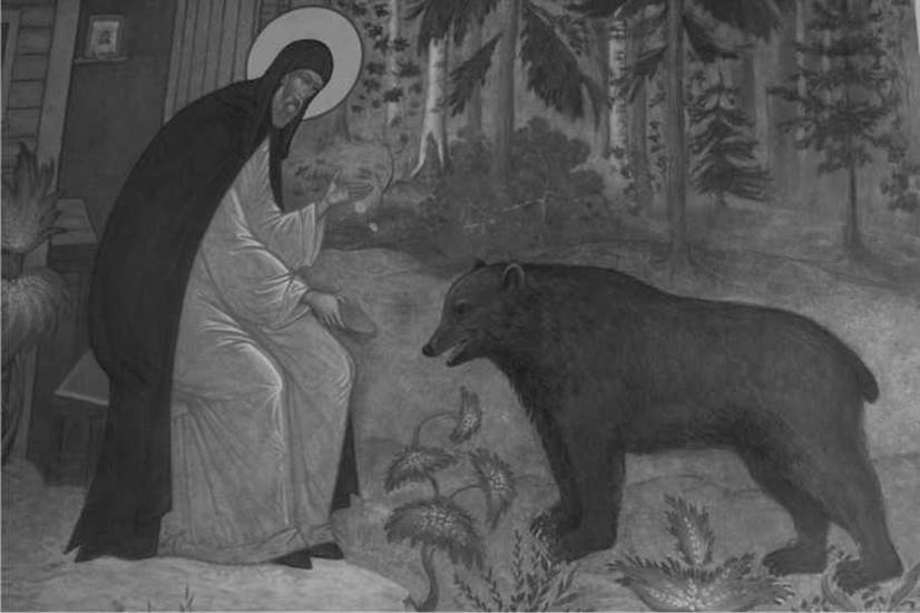 Prokhor Moshnin (Seraphim’s name prior to his monastic tonsure) was born into a pious merchant family in Kursk. In 1776 he visited the Kiev Caves Monastery, where the elder Dosifei advised him to practice the Jesus Prayer continuously and to enter the Sarov monastery (in Nizhnii Novgorod province). He arrived there in 1778, took monastic vows in 1786, and received the name Seraphim. From his disciples and early biographers, who relied both on his personal testimony and eyewitness accounts, we know that he had multiple mystical experiences, including revelations of Christ and many visitations by the Virgin Mary who guided him throughout his 55-year monastic life and healed him on a number ofoccasions from severe illnesses and injuries. Between 1794 and 1810 Seraphim lived a reclusive life in the forest outside the monastery, spending his time in the practice of the Jesus Prayer, reading Scripture and patristic literature, and engaging in manual labor. One day he was savagely beaten by robbers who left him crippled for the rest of his life; when the attackers were later arrested, he persuaded the authorities to let them go. He returned to the monastery in 1810, but remained in seclusion until 1825, when, at the command of the Virgin Mary, he began to receive people seeking his guidance and healing, and became one of the most renowned startsi of Russia.