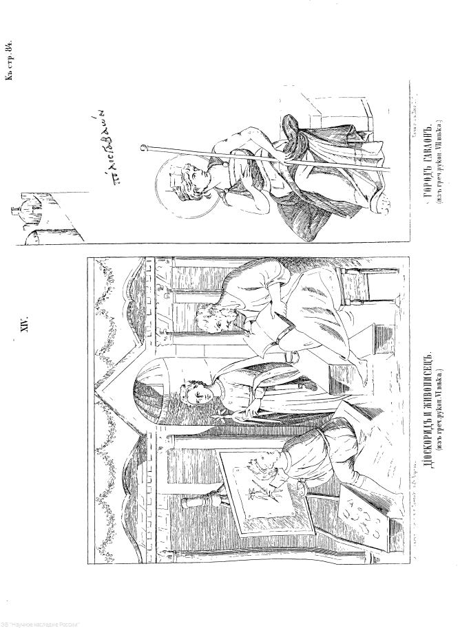 – Перед сидящим Диоскоридом (рис. 33) стоит красивая женщина, держа в руках мандрагору, т. е., корень растения, оканчивающийся человеческой фигурой. Внизу умирающая собака. Над женской фигурой надписано: εὔρεσις (изобретение). И так, это олицетворение. – Посреди стоит в нише под красивым полусводом та же женская фигура (изобретение), с мандрагорой в руке. Налево от зрителя, сидит живописец, спиной к этой женской фигуре, и, оглядываясь не совсем в ловком повороте, списывает мандрагору на пергамене, прибитом гвоздиком к пюпитре (вроде классной доски на ножках); а направо сидит сам Диоскорид и пишет, держа книгу на правом колене: обычай писцов того времени, наблюдаемый иногда и в нашей древней иконописи в изображении пишущих Евангелистов. Но для нас особенно важен живописец, списывающий растение с натуры: прямое указание на то, что древнехристианская живопись не разрывала своей связи с непосредственным изучением природы.