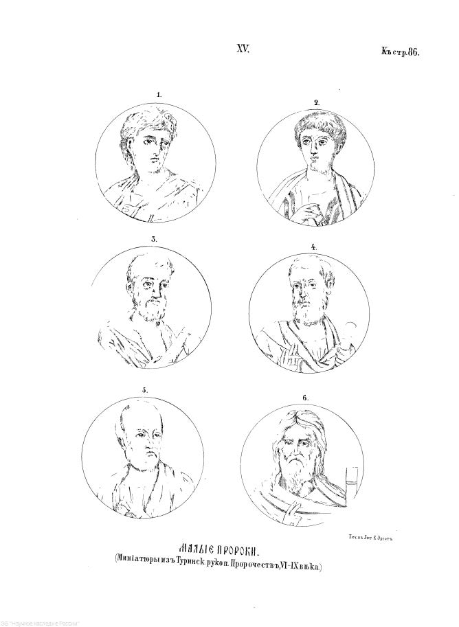 То же самое надобно разуметь и о прочих христианских типах. Каждое из священных лиц на разных иконах имеет черты общие и вместе различается по особенности в личном взгляде художника. Что не требовалось предварительного портрета с натуры для того, чтоб художественный тип с идеальностью характера соединял в себе кажущуюся портретность, достаточно вспомнить о превосходнейших типах ветхозаветных лиц, пророков и праотцов, в памятниках древнего христианского искусства. Именно здесь надобно обратить внимание на другую из двух вышеупомянутых рукописей VI в. Это Пророки (Малые) в Туринской библиотеке. Для любителей и художников предлагается здесь копия с шести икон (рис. 35), из которых две изображают юношеские типы Пророков Аввакума и Захарии, две – средних лет: Софония и Иоиля, и две – типов старческих: Ионы. Михея и пр. Сравнивая эти изображения с описаниями в русских подлинниках, не можем не отдать справедливости этим отличным руководствам в том, что несмотря на очень естественные отклонения их от древнехристианского предания, зависевшие от разных обстоятельств, все же они представляют замечательное с ним согласие, как это можно видеть из описания изображенных здесь Пророков, взятых из рукописи VI в. А именно: № 1 – Аввакум: млад аки Георгий. № 2 – Захария Серповидец: млад аки Димитрий. № 3 – Софоний: сед аки Богослов. – № 4 Иоиль: сед аки Илия. № 5 – Илия, характеризуется так: сед, космат. № 6 – Иона: сед, плешив, брада аки у Николы. – Михей: аки Андрей Апостол, по плечам косы. Андрей же характеризуется так: власы растрепалися; брада аки Иоанна Богослова.