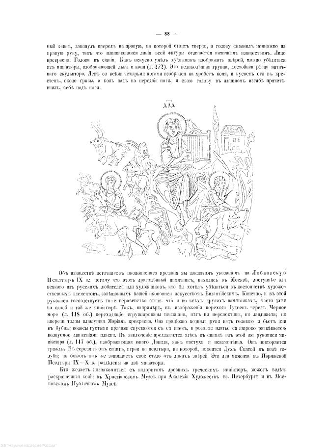 Об изяществе источников иконописного предания мы заключим указанием на Лобковскую Псалтырь IX в.; потому что этот драгоценный памятник, находясь в Москве, доступнее для всякого из русских любителей или художников, кто бы хотел убедиться в достоинстве художественных элементов, завещанных нашей иконописи искусством Византийским. Конечно, и в этой рукописи господствует тоже неравенство стиля, что и во всех других памятниках, часто даже на одной и той же миниатюре. Так, например, в изображении перехода иудеев Через Чермное море (л. 148 об.) переходящие сгруппированы неизящно, нет ни перспективы, ни ландшафта; но впереди толпы пляшущая Мариам прекрасна. Она грациозно подняла руки над головой и бьет ими в бубны; волосы густыми прядями спускаются с ее плеч, и розовое платье ее широко развевается, волнуемое движениями пляски. В заключение предлагается здесь в снимке (рис. 36) из этой же рукописи миниатюра (л. 147 об.), изображающая юного Давида, как пастуха и псалмопевца. Он повторяется трижды. В середине он сидит, играя на псалтыри, на которой, покоится Дух Святой в виде голубя; по бокам он же защищает свое стадо от диких зверей. Эти два момента в Парижской Псалтыри IX–X в. разделены на две миниатюры.