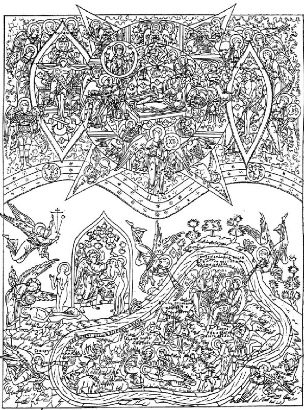 Эпизоды отделены архитектурными линиями, в кругах, в ореолах в форме миндалины; один помещен под аркой. Внизу история первых человеков и сыновей их Каина и Авеля. Земля, с ее бедствиями и грехами, очерчена продолговатым неправильным овалом, внутри которого, без соблюдения единства времени и места, изображено: Адам и Евва по изгнании из рая, наставляемые ангелом на ручное дело, Каин убивает Авеля и потом мучится своим злодеянием, Адам и Евва оплакивают Авеля, и наконец, звери. По четырем концам этого отделения по ангелу, дующему в трубу: это север, восток, юг и запад. Вне отделения – сотворение Еввы, и Господь, в виде ангела, благословляет первых человеков. В верхней части, посреди, в кругу Господь Бог опочил от дел своих на одре. По обоим сторонам, в ореолах миндальной формы, изображен обнаженный Иисус Христос, покрытый херувимскими крыльями. Направо, он стоит, в юношеском виде, и к нему обращается Бог Отец, как бы призывая на подвиг искупления. Налево, он распят на кресте, но распятие изображено так, что вместе с Богом Отцем и Духом Святым составляет одно целое, изображающее св. Троицу. Этот же сюжет, писанный отличным мелким письмом Строгановской школы, можно видеть в молельне московского купца Тихомирова.