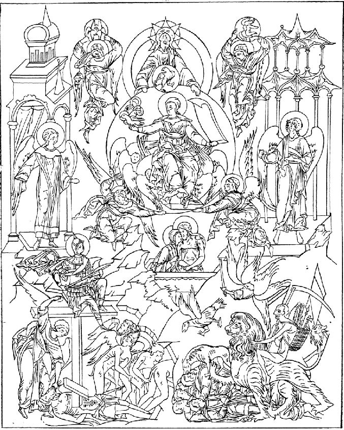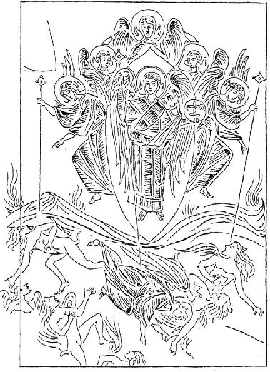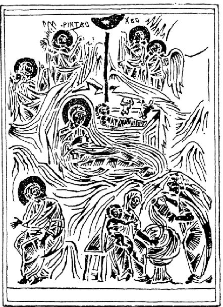 Этот сюжет имеет своей идеей тоже искупление, по собственно с развитием мысли о победе над смертью Искупителя. Эпизоды приведены в архитектоническую связь посредством зданий по обоим сторонам круга, в котором восседает Спаситель, и посредством симметрического помещения нижних эпизодов под серединным изображением Не рыдай мене мати. Христос изображен трижды. Во-первых, в юношеском типе, как Еммануил, в сказанном круге, несомом херувимами, с тетраморфом в деснице, то есть, с группой четырех символов Евангелистов в сокращении6. Над Ним тоже в кругах Дух Святый и Бог Отец, все вместе составляют св. Троицу; по сторонам по ангелу держат солнце и луну. Во-вторых, под кругом, Христос стоит во гробе, обнимаемый Богородицей: это Не рыдай мене Мати, перевод господствующий в итальянских школах XVвека,особенно в Ломбардской и Умбрийской.В-третьих, внизу налево Христос в воинском доспехе и с мечом сидит на кресте, водруженном на груди низверженного Ада. Справа от этого изображения Смерть идет на льве по телам мертвецов, которые поедают звери и хищные птицы. В храминах по сторонам Троицы по стоящему ангелу. Впереводе у Даженкура, один из них держит чашу, другой диск; на иконе, в собрании член. Общества Древн. Русск. Искусства А. Е. Сорокина, оба ангела в приподнятых руках держат по диску, а один из них в другой руке имеет кадило; по иным переводам оба держат по ковчежцу. В приложенном здесь рисунке оба ангела с пустыми руками – перевод, ясно указывающий на различие редакций в этом отношении. Любопытную особенность предлагает перевод по Филимоновскому рисунку начала XVII века. Вместо двух ангелов – в одной храмине сидит Богородица, а в другой – идет ангел с кадилом. Троякое присутствие Иисуса Христа означает троякую идею: о Господе Боге в Троице, его милосердии и о победе Креста над смертью. Полное объяснение этого сюжета можно получить из надписей над отдельными его частями. В Клинцовском подлиннике читается: «А что Спас сидит на херувимах, в кругу его писано: седяй на херувимах, видяй бездны, промышляя всяческая, устрашаяй враги, и возносяй смиренныя духом. На правой стороне ангелу, что чашу держит: чаша гнева Божия вина не растворенна, исполнь растворения. Милосердию (т. е. изображению Христа, стоящего во гробе) подпись: душу свою за други своя положи. А что Спас сидит на кресте вооружен, а тому подпись: смертию на смерть наступи, един сый святыя Троицы, спрославляем Отцу и Святому Духу, спаси нас. За тем же Спасом на поле: попирая сопротивныя, обнажая оружие на враги. Над Херувимом подпись: Херувим трясый землю, подвизая преисподняя. Смерти подпись: последний враг, смерть всепагубная. За смертью на поле подпись: вся мимо идут, а словеса Божия не имут преити. Над птицами и над зверьми подпись: птицы небесныя и зверие, приидите снести телеса мертвых. Духу Святому подпись: Дух сый воистину, Дух животворящ всяку тварь. Подписи в переводе у Даженкура несколько отличаются от этих. Над всей иконой подпись: Единородный сын Слово Божие, безсмертен и безначален и присносущ сый Сын Отцу – соответствует изображению Троицы. Подпись: взыде Господь от Сиона и глагола от Иерусалима и разсуди люди в юдоли – присовокупляет к этому сюжету идею о Страшном суде. Таким образом, эти две иконы: почи Бог и Единородный Сын соответствуют между собой как начало и конец миру, сближение 
