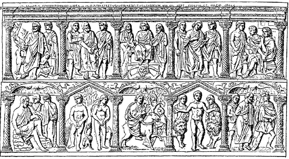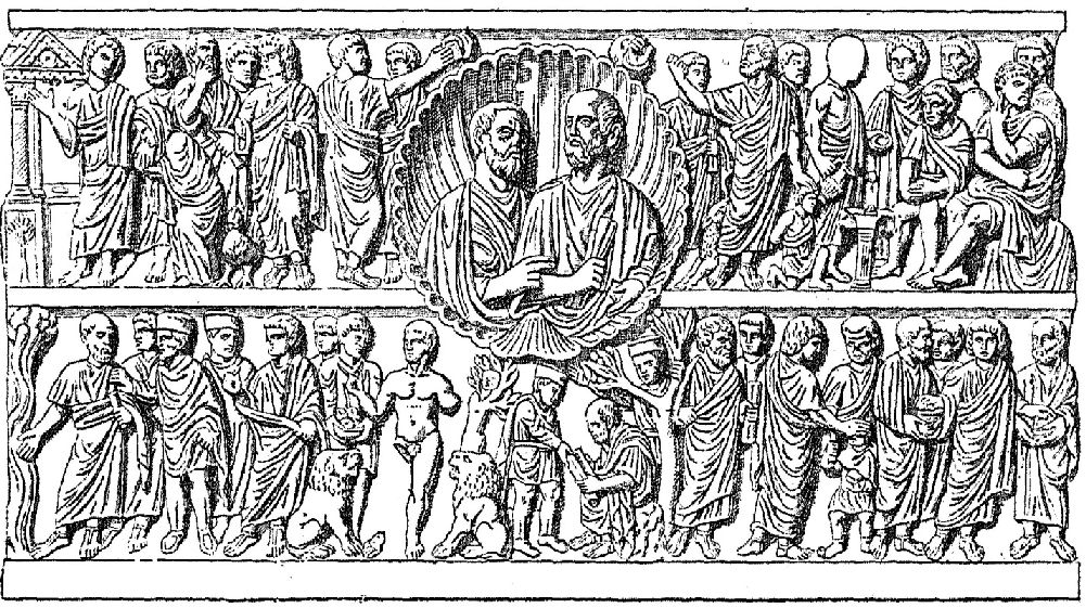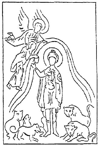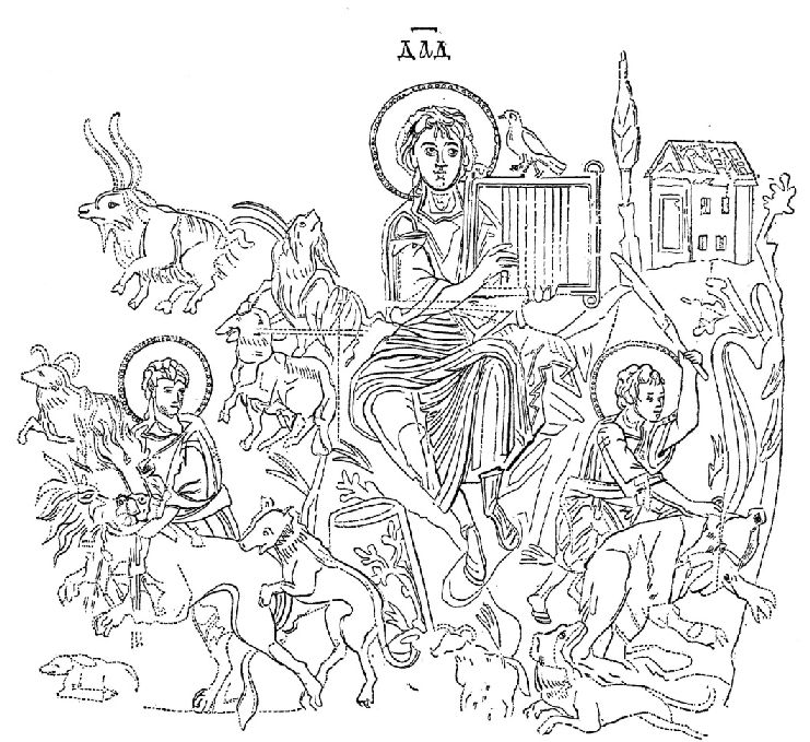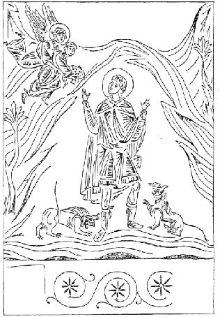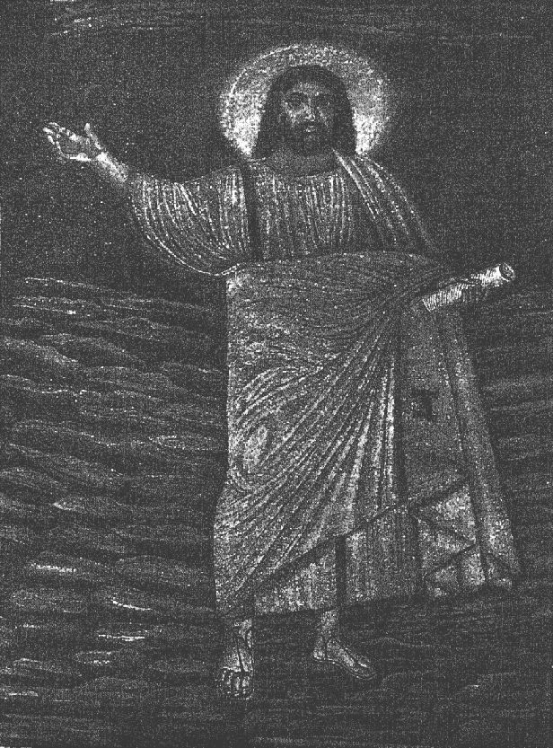 Издается здесь по снимку в атласе к сочинению Garrucci, Storia dell’arte V, tar. 324, 2, сравнительно более точному, чем гравюра, воспроизведенная по Боттари при этом сочинении Ф. И. Буслаева в «Сборнике Общ. др. рус. иск.». Сообразно с новым рисунком, опущены и одно место о «типе Спасителя с бородою», относящееся к старому, неправильному снимку. Прим. ред.