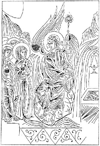 Чтобы дать понятие о многоличных переводах, выражающих как бы целый богословский трактат или дидактическую поэму, здесь прилагаются два снимка (рис.1 и 2) с иконописных рисунков XVII в., из собрания г. Филимонова, соответствующие двум первым из этих четырех сюжетов, так как самый оригинал в Благовещенском соборе сделался вовсе недоступен не только для снятия с него копии, но и для подробного рассмотрения, по причине массивной ризы, которой скрыты все подробности иконы.