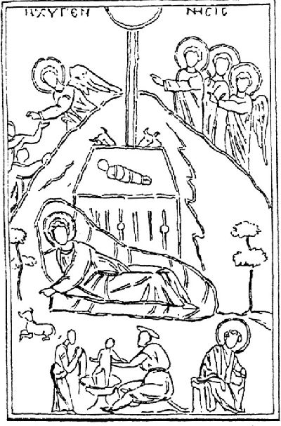 В такой же мере можно бы доказать сличением с древнейшими памятниками первобытность и всех других редакций праздников, описанных в наших подлинниках, но тогда эта статья превратилась бы в иконописный подлинник. Достаточно будет присовокупить, что Греческий Подлинник Дионисия, изданный Дидроном, предлагает не только значительные отклонения от наших, но и очевидные подновления. Так в Благовещении принята в нем только одна редакция, именно Богородица с веретеном; а в Рождестве, хотя упомянуты пастухи и волхвы, но нет ни старика в мохнатой коже, ни Соломеи с купелью. Богородица и Иосиф стоят на коленях перед Иисусом, лежащим в яслях. Иосиф скрестил руки на груди. Впрочем, согласно русским преданиям, событие совершается в пещере, а не в хлеву38.