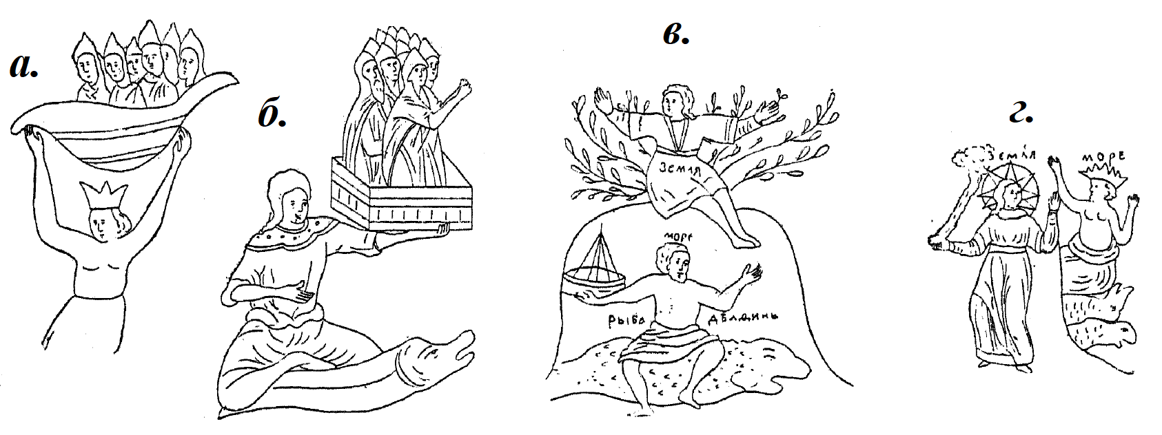 Соответственно этим символическим изображениям Византийским, в наших подлинниках сказано: «море и земля кругло: отдают телеса мертвых»; – а на русской миниатюре Страшного Суда земля представлена в виде женщины. В виде женщины же, обнаженной, с короною на голове, представлено море, отдающее мертвецов в лодке, на предлагаемой здесь (рис. 8) миниатюре из рукописного Апокалипсиса XVI в., принадлежащего автору (под литерою а). Два другие изображения того же предмета – одно в виде одетой женщины (под литерою б) и другое – в виде старца (под литерою в) взяты из рукописных Апокалипсисов ХVIII в., принадлежащих автору же; последнее из рукописи, означенной 1705 годом. Оттуда же взяты изображения земли и моря в виде женщин (под литерою г). В доказательство необыкновенной живучести символических изображений, отзывающихся античной формой древне-христианского искусства здесь же предлагается из той же рукописи 1705 г. (рис. 12 и 13) символическое представление