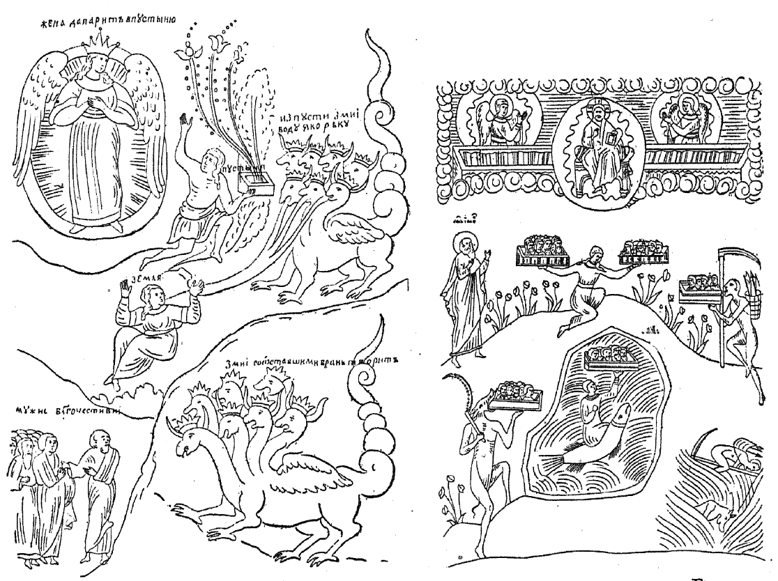 Земли и Пустыни. Эта миниатюра служит объяснением следующих мест в Толковом Апокалипсисе: «И егда виде змий, яко низложен бысть на землю, гоняше жену, яже роди мужеский пол. И дан бысть жене две криле орла великого да летит в Пустыню. И изверже уж изо уст своих за женою воду яко реку, да сию сотворит рекою похищенную. И поможе Земля жене, и отверзе Земля уста своя и поглоти реку, юже изверже змий изо уст своих» (зачало 35-е). По мысли этого текста живописцу следовало изобразить ландшафт: с одной стороны, поместить змия, извергающого поток, который поглощается землею, с другой стороны представить Апокалипсическую жену, которая летит на орлиных крыльях в Пустыню, спасаясь от змия. Но так как древне-христианский художник нe имел понятия о живописи пейзажной, то он и Землю, и Пустыню не иначе мог представить, как в символических образах, заимствованных им из античных барельефов. Потому все это изображение носит на себе характер скульптурного стиля. Для того, чтоб сделать полное обозрение того эпизода в Страшном Суде, где земля, море, смерть и ад отдают телеса мертвых, предлагается здесь изображение с миниатюры из рукописного Апокалипсиса ХVIII в., в Императорской Публичной Библиотеке, в 4-ку, № 229, лист 276 обор.