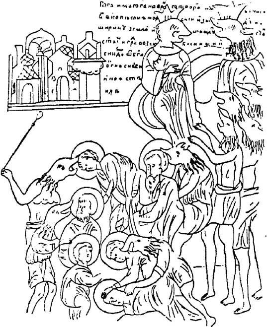 (Приложенная здесь (рис. 7) миниатюра снята из рукописного Апокалипсиса ХVIII в. в Императорской Публичной Библиотеке, в 4-ку, № 229, лист 316 об).