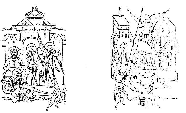 Уже при беглом обозрении общего состава нашего описания, нельзя не заметить в нем, при множестве несвязных эпизодов, смешение двух изображений, отделяемых в византийском подлиннике; именно Второе пришествие Христа, и потом Страшный Суд218. В этом отношении наш подлинник представляет сходство с изображениями западного искусства в древних фресках и барельефах. Что же касается главнейших подробностей, то в них он строго держится византийского предания. Таковы, например, огненная река, пошедшая от престола Верховного Судии; по сторонам Его изображения Богоматери и Предтечи; рука, спускающаяся из облака, с душами праведных, и с мерилом, или весами; Моисей, указывающий жидам Христа и проч.; даже самые надписи мучений в византийских изображениях напоминают наши выражения на лубочных картинах и в духовных стихах: скрежет зубов, червь неусыпающий, огонь неугасающий и т. п.