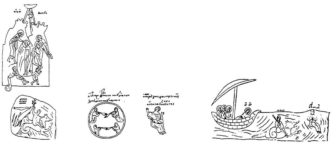 Наконец, на одной и той же миниатюре представлены и Море в виде мужской фигуры на чудовище, и Ветер; а на другой стороне Спаситель, плывущий в ладье с Учениками. Эта миниатюра при стихе: и повеле бури и ста в тишину и умолкоша волны его. Пс. 106 (рис. 21).