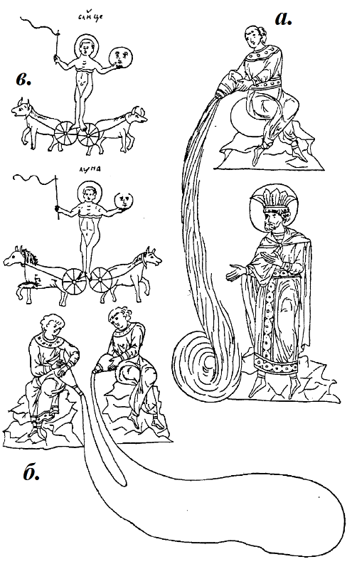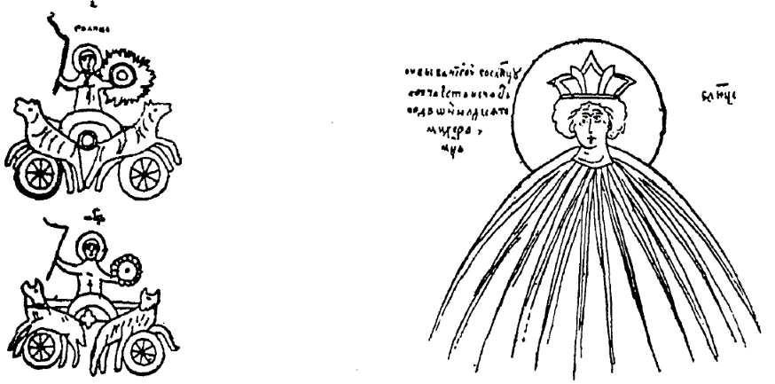 Но всего замечательнее античное влияние в изображении солнца и луны в виде человеческих фигур, скачущих на животных, которые запряжены в колесницы. В Углицкой миниатюре колесницы эти только намечены, будто срисованы с самого грубого прилепа. Человеческие фигуры – не олицетворение светил, а божества, из которых у каждого в руке по светилу. Головы этих языческих божеств – жалких подобий Аполлону и Диане – окружены сиянием. Солнце с колесницей и животными – красного цвета, а луна – желтого. Миниатюра соответствует тексту сотворшему светила велия... солнце в область дни... луну и звезды в область нощи. Пс. 135 (рис. 22).