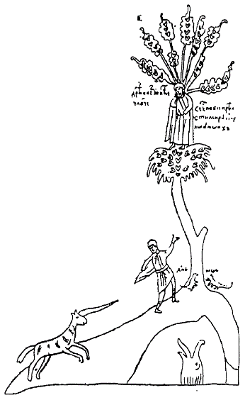 Эта притча во всей подробности с толкованием была известна нашим предкам из 12-й главы Истории о Варлааме и Иоасафе, откуда издавна помещалась уже в древнейших списках Прологов под 19 числом Ноября, когда празднуется память и самого Царевича Иоасафа. Притча об единороге, пропасти, дереве и о двух мышах, принадлежит к тем, которыми пустынник Варлаам украшал свои назидательные беседы с Индийским Царевичем. Людей, непрестанно в телесных сластях пребывающих – говорил Варлаам – и души свои оставляющих томиться голодом, я полагаю подобными человеку, который бежал, спасаясь от страшного единорога, и вдруг с разбегу упал в глубокую пропасть. Но, падая, ухватился он за дерево, ветвями спускавшееся в пропасть, и на ветвях утвердил свои ноги. Взглянув вниз, увидел он – две мыши, одна белая, другая черная, непрестанно подгрызают корень того дерева; посмотрев на дно пропасти, увидел страшного змия, дышащего огнем и готового пожрать его. Взглянув на ветви, на которых он утвердил свои ноги, увидел от стены четыре головы Аспидовы, а от ветвей тех капало немного меду: и, забыв все грозящие ему опасности, он устремился ко сладости малого меда оного. Эту притчу Варлаам объясняет своему ученику так: Единорог – смерть, гоняющаяся за человеком; Пропасть – мир сей, исполненный всяческих зол и смертоносных сетей; Дерево, за которое ухватившись мы держимся – временная жизнь каждого человека; Мыши, Белая и Черная – день и ночь. Четыре Аспида – четыре стихии, из которых составлен человек. Огнеобразный и Неистовый змий – утроба адская, Медвяныя же Капли – сладость мира сего, прельщаясь которой человек оставляет заботу о своем спасении.