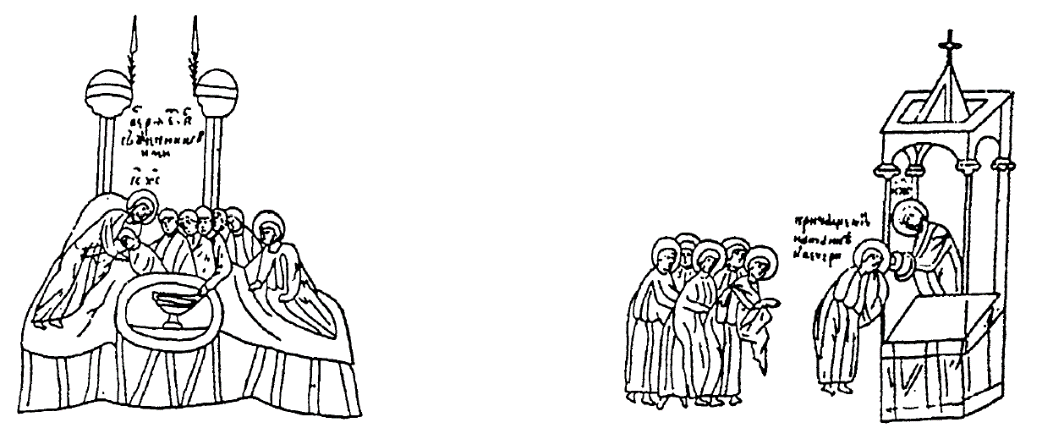 Самые замечательные из новозаветных изображений в нашей рукописи, особенно важные для истории иконописи, имеют предметом Тайную Вечерю. Снимки с двух миниатюр этого содержания прилагаются здесь в рисунках 25 и 26.