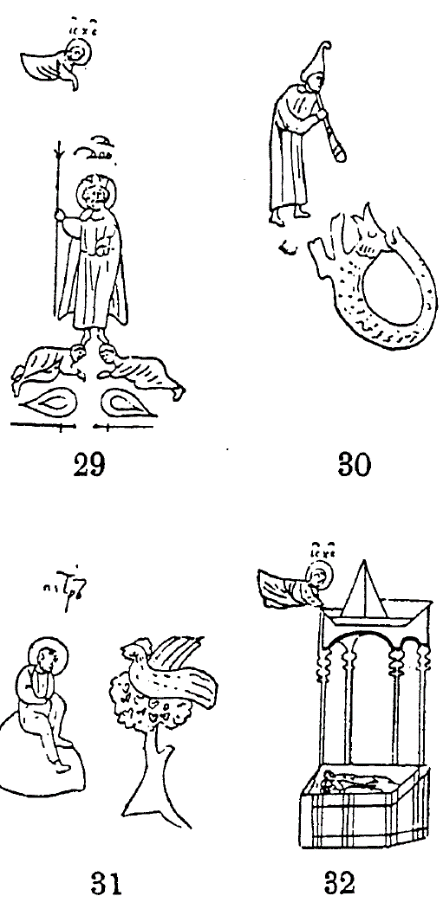 9) Для истории христианской археологии и архитектуры заслуживает особенного внимания изображение алтаря, под которым почивают мощи св. мучеников (рис. 32), в миниатюре к тексту: Хранит Господь вся кости их. Пс. 33.