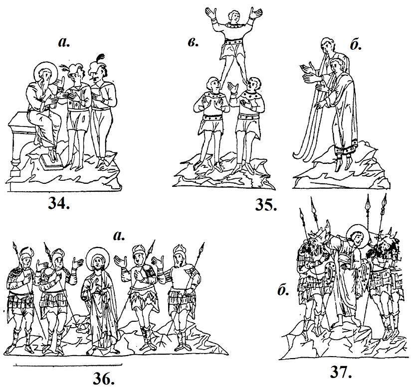 2) Многие миниатюры восходят своим началом, вероятно, к первым векам христианства, когда новообращенные художники для выражения идей новой религии иногда брали общепринятые античные формы. Не распространяясь об этом предмете, хорошо известном всякому знающему историю просвещения средневековых христианских народов, почитаю не лишним обратить внимание читателей на то, что Византийские рукописи были для древней Руси проводником не только древне-христианских идей, но и античных форм, выражающих эти идеи. Противники византийского направления, гадающие о нем только по наслухам, со временем, без сомнения, изменят свое мнение, когда во всей полноте будет объяснено классическое влияние, внесенное к нам из Византии. Во всяком случае для многих в настоящее время будет приятной новостью узнать, что в каком-нибудь Угличе во второй половине XV века, и наивный писец и его невзыскательные читатели лучше многих образованных людей нашего времени понимали античные формы, принятые христианским искусством в самую раннюю эпоху его развития и господствовавшие у нас даже во времена Петровской реформы. Правда, что эти формы были уже очень искажены, потому что отвечали самым ограниченным требованиям вовсе не эстетического вкуса, как теперь лубошные издания удовлетворяют простонародье. Зато, чем невзрачнее само очертание этих миниатюр, тем поразительнее в них явственные следы античных форм древне-христианского искусства, на которые средневековое варварство наложило свою тяжелую руку. Оттого эти античные формы стали так неуклюжи, что только при пособии археологии можно было открыть в них слабое подобие некогда господствовавшим изящным типам.