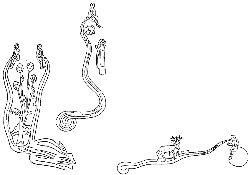 В прилагаемых здесь 33-м рисунке (под литтерами а и в) сняты Годуновские миниатюры (к Псалм. 41 и 136), которые очевидно одной редакции с приложенными выше из Углицкой рукописи, может быть, даже с них списаны, но во всех мелочах, и особенно большим изяществом формы от них отличаются. Точно также сходны с Углицкими и все прочие миниатюры и столько же от них отличны. Как, например, выше и художественнее Углицких миниатюр это изображение реки в виде античных юношей? (в том же снимке, под лит. б).
