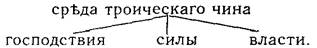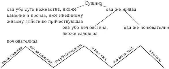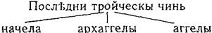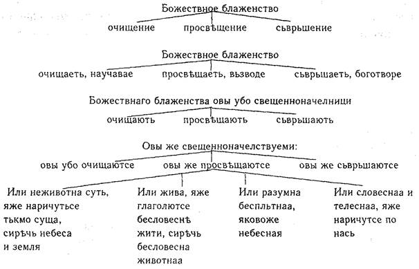 Горе бо рече, яко горнейше силы свещенноначельствуют сущиими по тех, и средние последними, и последние их иже в чловецех свещенноначелници. Ни бо рече, яко сьи чин и начельствует сущиими по нем, и начелствуетсе от тех, но сице рече, яко прьвый чиин (так!) начельствует сущиими по нем, начелствует же се сущиими прежде его. Сице и о прочиих достоит разумевати.