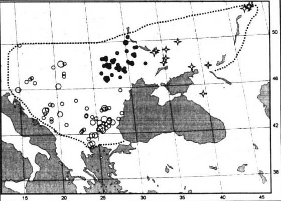 Карта 1. Границы Балкано-Карпатской металлургической провинции медного века и распространение в ее пределах памятников с датированными по 14С образцами. Незакрашенными кружками обозначены памятники народов, занимавшихся горным делом и производством меди; залитыми кружками – родственные им оседло-земледельческие народы безрудной зоны, получавшие металл от своих соседей; звездочками – памятники степных скотоводов, также получавших металл из Балкано-Карпатских центров; пунктиром – границы провинций.