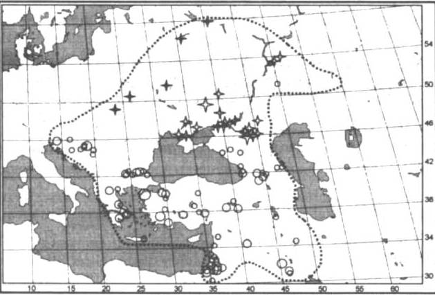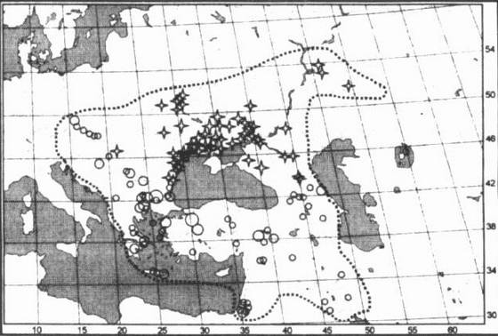 Карта 2. Границы Циркумпонтийской провинции в раннем бронзовом веке и распространение в ее пределах памятников с датированными по 14C образцами. Кружками обозначены памятники многочисленных групп южных оседло-земледельческих народов; звездочками – блок степных скотоводческих культур; пунктиром – границы провинции.