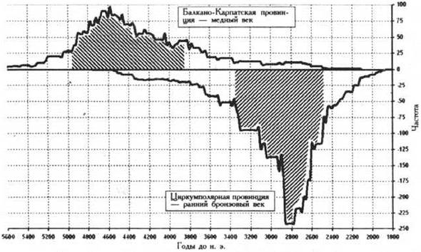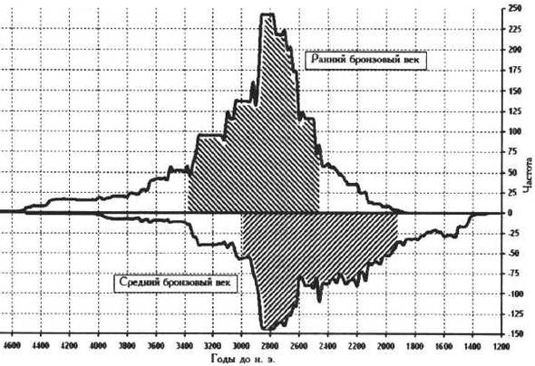 За веком меди следовал ранний бронзовый век, с которым связано формирование Циркумпонтийской металлургической провинции. К этому периоду относится наибольшее число датировок – более шести сотен. В согласии с относительной хронологией определяется и общий диапазон радиоуглеродных датировок: от 3800 до 2000/1900 гг. до н.э. Опять-таки 68%-й уровень вероятности этой совокупности датировок сужает рамки диапазона примерно до 3300–2500 гг. до н.э. (33–25 вв.).