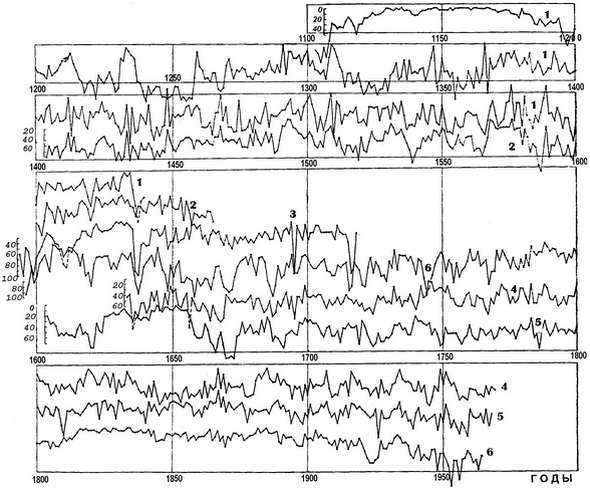 В качестве примера рассмотрим применение дендрохронологического метода для датировки деревянных сооружений заполярного города Мангазеи (66o 36’ c.ш. и 82o 16’ в.д.) (Шиятов С.Г. 1972), который сыграл большую роль в первоначальном освоении Сибири. Город был заложен в низовьях реки Таз в 1601 году и оставлен в 1672 году. С тех пор на территории Мангазейского городища постоянных поселений не существовало. От прежних деревянных зданий и сооружений остались самые нижние 3–5 венцов, древесина которых, погребенная в землю в слой вечной мерзлоты, большей частью хорошо сохранилась. Шиятов С.Г. для определения времени постройки брал из наиболее сохранившихся бревен по несколько срезов (всего было взято 185 срезов из различных сооружений). По этим данным была построена “плавающая” шкала, датировка которой осуществлялась методом перекрестного датирования по графикам годичного прироста (рис. 1). Наличие в срезах довольно значительного количества колец (не менее 150) и знание промежутка времени существования Мангазеи намного облегчали датировку. Абсолютная дендрохронологическая шкала за 867 лет (с 1103 по 1969 гг.) была построена перекрестным наложением шкал древней древесины и по найденным в районе Приобского Севера и в окрестностях Мангазеи ныне живущим старым деревьям – лиственницам и елям, внутренние кольца которых образовались еще до основания города. В самой верхней части (кривые 1–3) приведены индексы прироста древесины лиственницы из мангазейских сооружений, а в нижней (кривые 4–6) – индексы прироста этих живущих деревьев за время с 1597 по 1969 гг. Правильность абсолютной датировки подтвердилась также известными по историческим документам датами постройки некоторых сооружений, древесина из которых была использована в настоящем исследовании.