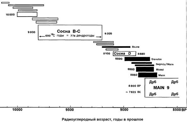 При построении плавающих мастер-хронологий относительный возраст, извлекаемых из отложений деревьев, определяется с помощью радиоуглеродного метода. В представленном на рис. 2 примере разработки дендрохронологической шкалы (Becker B. and Kromer B. 1986) ряд “Main 9”(охватывающий промежуток времени с 7215 г. до н .э. до 7825 г. до н.э.) отмечает конец хорошо воспроизводящихся хронологий по дубу, оцененный с помощью радиоуглеродного метода в ~ 8800 “радиоуглеродных” лет от современности. На рисунке также представлены некоторые ископаемые дубы, более древние чем ряд “Main 9”. Эти дубы, относительный возраст которых оценен с помощью радиоуглеродного метода, начали расти в долинах Рейна приблизительно в 9200, Дуная – 8890, Мозеля – 8880, Майна – 8860 “радиоуглеродных” лет от современности. Видно, что дальнейшее расширение дендрошкалы может быть достигнуто с использованием уже деревьев сосны (климатические условия оказались более суровыми), захороненных в этих отложениях и покрывающих без разрывов последние более чем 10000 лет.