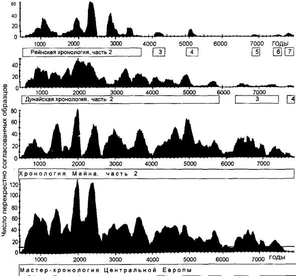 До окончательной увязки в течение нескольких лет хронология по дубу не была абсолютной и содержала три части: абсолютную мастер-хронологию (до 4000 г. до н.э.), плавающую мастер-хронологию (4000 – 7200 гг. до н.э.) и более раннюю часть (до 7200 г. до н.э.), указанную на рис. 2 как хронология “Main 9”. В 1993 г. эти части были увязаны воедино и как показано Беккером (Becker B. 1993), хронология последних 9900 лет воспроизводится минимум 15–25 перекрестно датированными образцами, что является достаточным для перекрестного датирования среди индивидуальных кривых мастер-хронологии. На рис. 3 приведена картина воспроизведения мастер-хронологии по дубу из соответствующих дендрохронологических рядов деревьев, взятых из долин Рейна, Майна и Дуная и исторических и доисторических стоянок на юге центральной части Европы. Установление этой хронологии требовало связывания тысяч современных, исторических и доисторических записей колец деревьев посредством перекрестного датирования. Эта работа Беккера ярко демонстрирует надежность хронологии, представляющую воспроизведение мастер-хронологии для голоцена. Веской проверкой абсолютной дендрохронологии является доказательство воспроизводимости перекрестным датированием независимо установленных хронологий годичных колец, что и было прослежено сравнением хронологии по дубу в Германии с ирландской хронологией также по дубу. Наиболее длинные хронологии по деревьям сосны и дуба приведены ниже:
