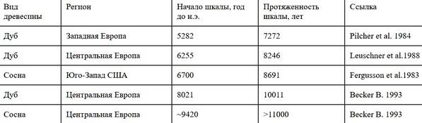 По ирландскому дубу в 1982 году была создана абсолютная хронология, простирающаяся до 13 г. до н.э. и плавающая хронология от приблизительно 200 г. до н.э. до 5300 г. до н.э., которая к 1984 году была связана с абсолютной шкалой (Pilcher J.R. et al. 1984). К этому времени хронологию по германским деревьям удалось продлить до рекордной протяженности – до 10 тысяч лет от современности (Becker B. and Kromer B. 1986). Следует заметить, что две хронологии: одна из Германии, а другая из Северной Ирландии были перекрестно датированы, что позволило установить европейскую мастер-хронологию по дубу протяженностью до 5300 лет до н.э.!
