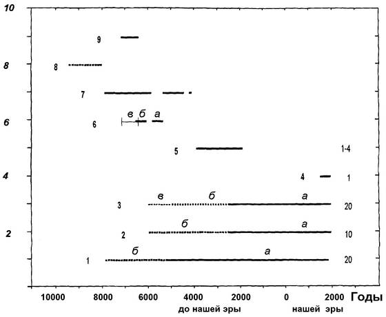 Фактическое состояние высокоточных измерений 14С в непрерывных сериях дендрохронологических данных для целей калибровки радиоуглеродной шкалы проанализировано в работе (van der Plicht J. 1996) и отражено на рис. 4. Цифры справа указывают на временное разрешение (число колец) конкретной серии измерений. Линия 1 определяет наиболее длинную во времени часть непрерывной калибровочной кривой, полученной в Белфастском университете по серии измерений в блоках древесины ирландских дубов по 20 колец, охватывающую временной интервал 1840 г. н.э. – 5210 г. до н.э. (а), расширенную данными измерений в блоках немецких дубов до 7980 г. до н.э. (б). Линией 2 показан временной интервал измерений, выполненных в университете в Сиэттле, в блоках по 10 колец деревьев из США (а) и германских дубов (б) за интервал времени с 1945 г. н.э. по 6000 г. до н.э. с вдвое лучшим разрешением, чем предыдущие. Линией 3 изображена калибровочная шкала из результатов исследований, полученных в университетах Сиэттла и Белфаста и представляющих скомбинированные в 20-летнюю серию высокоточных измерений из данных по американским деревьям в 10-летних блоках и 20-летних блоках ирландских деревьев: участок а покрывает временной интервал 1940 г. н.э. – 2490 г. до н.э., данные затем были сначала расширены на интервале 2510–4990 гг. до н.э. (б), а затем продлены до 6000 г. до н.э. (в). Интервал погодичных измерений концентрации 14С в каждом кольце американской ели с 1510 по 1954 гг. определен в университете в Сиэттле и показан линией 4. Интервал с 1935 г. до н.э. по 3900 г. до н.э. (линия 5) покрыт измерениями концентрации 14С в германских дубах с временным разрешением от 1 до 4 лет, выполненными в университетах Гронингена и Претории. Линиями 6 изображены дополнительные данные измерений содержания 14С в деревьях остистой сосны вне 5000 г. до н.э., полученные в Аризонском университете на интервале лет 5355–5815 гг. до н.э. (а) и 6090–6550 гг. до н.э. (б) и в Сиэттле – 6440–7160 гг. до н.э. (с). Линией 7 представлены калибровочные данные, полученные в Гейдельбергском университете из германских хронологий по дубу, протянутых до 7875 г. до н.э. Линия 8 представляет предварительную калибровочную кривую, основанную на хронологии по сосне, охватывающую измерения концентрации 14С на интервале 7981–9439 гг. до н.э., выполненные в Гейдельбергском университете.