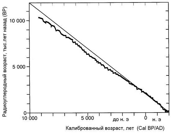Рис. 5. Радиоуглеродная калибровочная кривая (радиоуглеродный возраст, годы BP), полученная датированием колец деревьев (календарные годы, BC/AD). Прямая линия означает равенство “радиоуглеродного” возраста абсолютному возрасту образцов (14С годы = дендрогодам).
