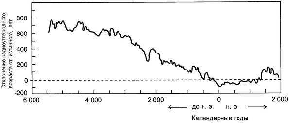 Естественный уровень концентрации 14С был нарушен в результате антропогенного воздействия: со второй половины прошлого века имеет место понижения уровня за счет сжигания ископаемого топлива (уголь, газ) (Suess H.E. 1955), не содержащего 14С; с конца 50-х годов нашего века началось резкое увеличение уровня 14С в земной атмосфере в результате наземных испытаний атомных устройств (Nydal R. 1968). В 1958 году было обнаружено в детальных измерениях (de Vries Hl. 1958), что и естественное содержание 14С может испытывать колебания на шкалах времени в несколько десятилетий с амплитудой до 2% над средним уровнем. В дальнейшем началось широкое исследование причин естественных вариаций концентрации 14С, связанных с солнечной активностью, напряженностью геомагнитного поля, вспышками сверхновых звезд (Suess H.E. 1965; Stuiver M. 1965; Константинов Б.П. и Кочаров Г.Е. 1965; Damon P.E. et al. 1966 и др.). Конечно, изменение концентрации 14С в земной атмосфере во времени затрудняет интерпретацию радиоуглеродных датировок. Требуется калибровка таких датировок, т.е. придание им исторического или календарного возраста. Это может быть сделано с помощью калибровочных кривых – графиков, описывающих соотношение в прошлом между календарными возрастами и измеренными радиоуглеродными датами. Заметим, что радиоуглерод датирует органическое вещество исследуемого материала, а не событие. В археологичесих исследованиях часто встречаются долгоживущие материалы, например, древесина может иметь возраст в сотни лет, и важно, из какого участка взят образец на датировку. Археолог должен тщательно привязать объект, из которого взят образец, к событию. При радиоуглеродном датировании для калибровки используют материалы, возраст которых установлен с помощью дендрохронологического метода. Трудами многих ученых были составлены повсеместно принятые теперь калибровочные кривые для радиоуглеродной датировки, основанные на датировке методом годичных колец дерева. Эта калибровка привела к некоторым фундаментальным новым датировкам в археологии. Так, благодаря калибровочной кривой установлено, что даты, полученные радиоуглеродным методом для археологических целей, омоложены начиная уже примерно с первых сотен лет до нашей эры, и омоложение тем большее, чем древнее исследуемый образец.