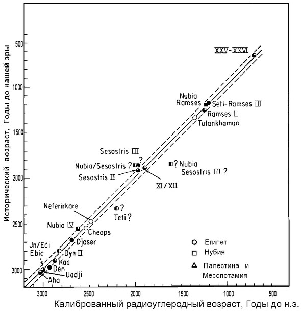 Прогресс в радиоуглеродном датировании и точности калибровки позволяет разрабатывать калиброванные радиоуглеродные хронологии археологических объектов в ряде регионов, и, в первую очередь, для исторических времен. По-видимому, необходимость такой хронологии для археологии Ближнего и Среднего Востока не вызывает сомнения. Известно, что абсолютное датирование в археологии Ближнего Востока в конечном счете основывается на качестве и надежности исторических календарей Египта, Месопотамии и др. Египетский исторический календарь является главным для археологического датирования во многих частях Ближнего Востока, заметное положение также занимает хронология Месопотамии. Интерпретация древних записей часто приводит к различиям мнений среди экспертов. Возможны различные интерпретации этих древних источников, а часто и нельзя получить ответа относительно их надежности. Радиоуглеродное датирование является независимым от исторического датирования и поэтому может быть законным образом использовано в проверке и возможной коррекции древних исторических хронологий, при условии, что разрешение и точность радиоуглеродных измерений являются достаточно высокими. Как показывают исследования (Hassan F.A. and Robinson S.W. 1987), применение высокоточной радиоуглеродной калибровки дает радиоуглеродные даты образцов, которые находятся в прекрасном согласии с историческими датами до нашей эры (рис. 6). Конечно, необходимо получать тщательно отобранные серии десятков или даже сотен новых высокоточных дат, чтобы сформировать базы для развития калиброванной радиоуглеродной хронологии археологии того или иного региона.