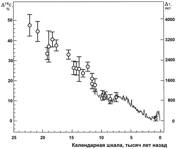 Рис. 7. Изменение концентрации радиоуглерода (Δ14C) и отклонение радиоуглеродного возраста от календарного (Δt) за последние более чем 20 тысяч лет; данные по древесным кольцам (сплошная кривая) и кораллам (кружки).