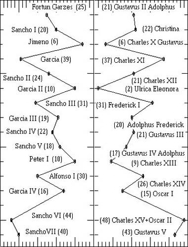 Забавно, но в сборнике «История и антиистория», c.431 я также привожу подобную цитату из статьи М. М. Постникова и А. Т. Фоменко, однако указанная «елочка» получена именно по заявленной отцом-основателем методе, правда без всяких манипуляций и подтасовок исходных данных, в чем А. Т. Фоменко без труда может убедиться сам, рассчитав по собственным программам для нее, предложенную им меру l (если эти программы действительно были и сохранились, а не являются наспех слепленными однодневками добровольного или оплаченного студента-помощника). Если НФ все еще считают, что я ничего не считал – предлагаю эксперимент: найти «на глазок» в исходных данных, взятых из любого источника без перестановок и пропусков столь же похожую пару династий, как найденный мной параллелизм современных шведских и средневековых наваррских королей.