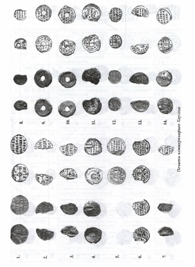 Моливдулы херсонских коммеркиариев известны практически с самого начала исследования Херсонеса. Единичные экземпляры в свое время издавали многие исследователи: Г. Шлюмберже1937, И.И. Толстой1938, Н.П. Лихачев1939, Дж. Эберсольт1940, К. Константопулос1941, А.Ф. Вишнякова1942, В. Лоран1943. Впервые попытку собрать все печати коммеркиариев воедино предприняла И.В. Соколова1944. В труде исследовательницы, посвященном монетам и печатям византийского Херсона, моливдовулы коммеркиариев составляют вторую по значительности группу, состоящую из 18 экземпляров1945.