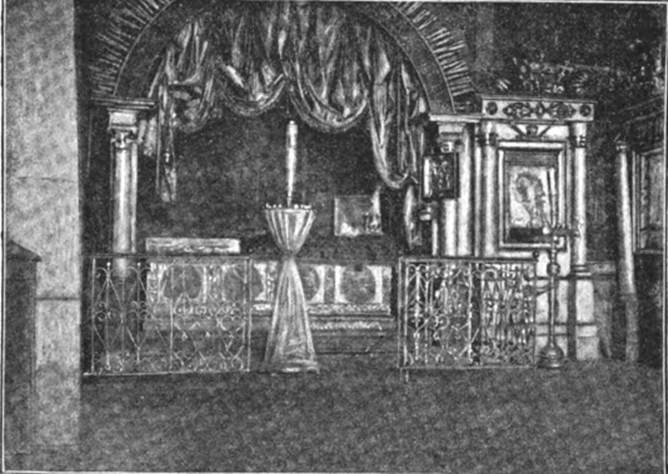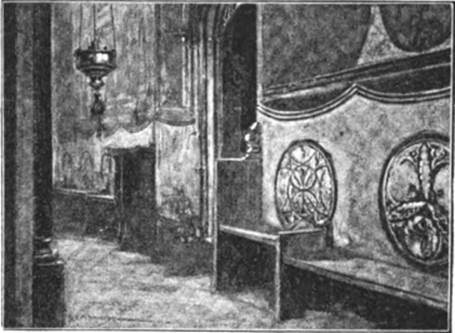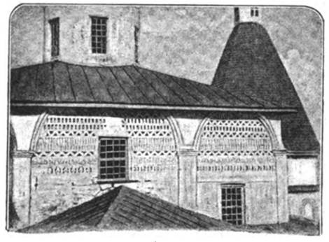 При выходе из Рождественской церкви по обеим сторонам дверей до сих пор сохранились места для келаря и казначея простого древнего устройства с откидными сиденьями (см. рис. 9). Эти места, редко где уцелевшие в наших монастырях, вызывают в памяти одну черту древнего монастырского устава. В старину монастырские власти – келарь и казначей становились у дверей церкви для наблюдения за приходившими в церковь и уходившими из нее иноками.